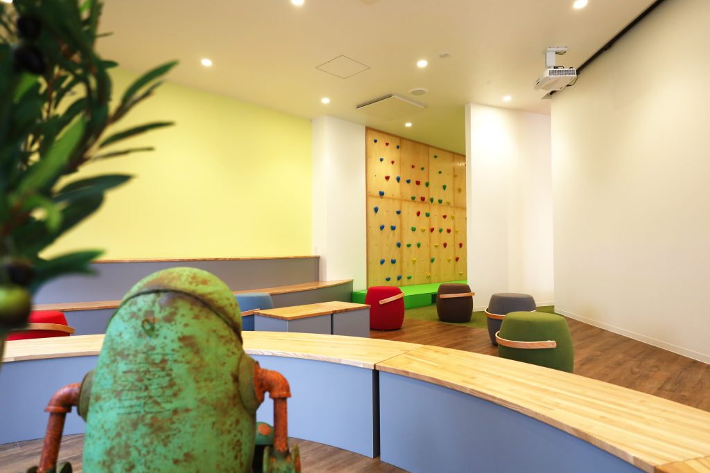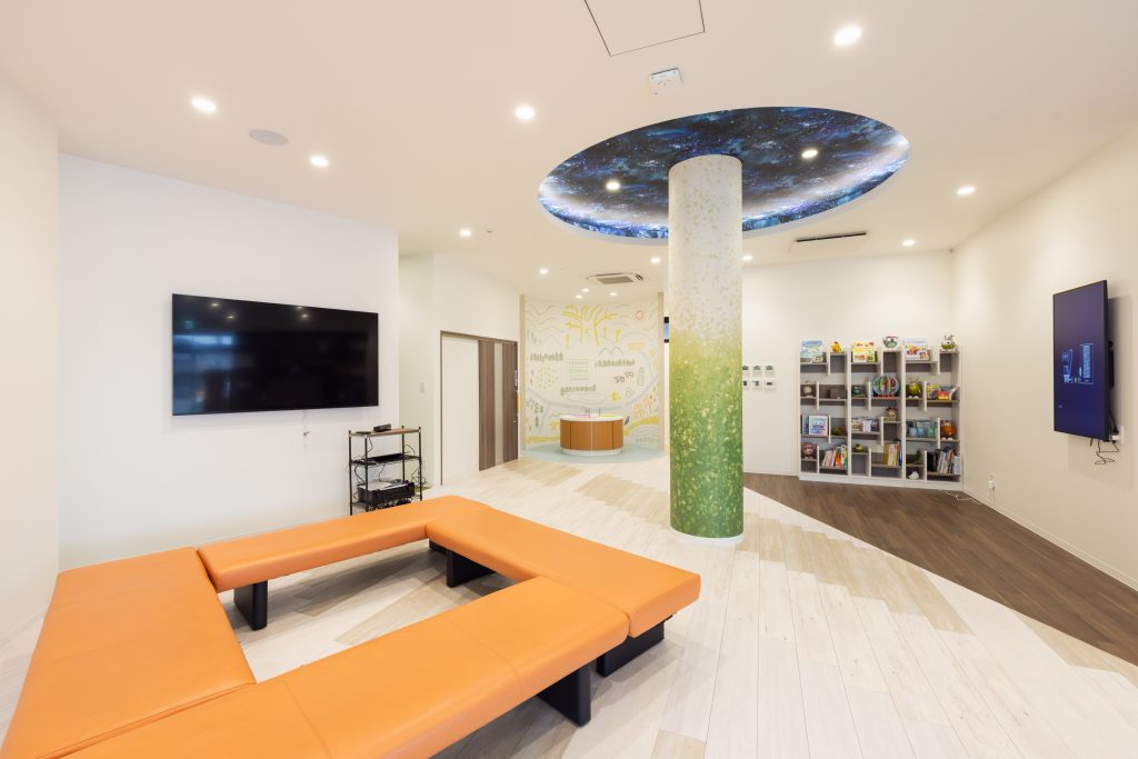 また、建物内の小道に見立てた通路の反対側に配置した放課後等デイサービスは、中央の丸柱をシンボルとして空や芝生の内装、ボルタリングなど子供たちがワクワクできる室内としています。